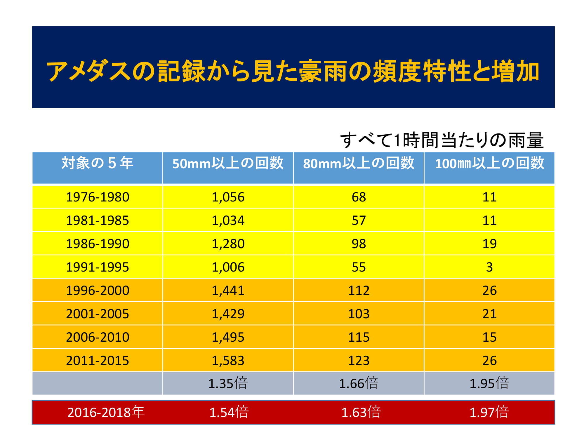 河田氏によると、雨の降り方は3つに分けられる。1つ目は、1,000km2以上の広い地域に、数時間にわたって1時間当たり40mmから100mmの大雨が降る「広域豪雨」。台風と前線との組み合わせなどで生じ、東京で発生すれば荒川などの大きな河川の氾濫を招く。2つ目は「集中豪雨」。広域豪雨より狭い地域で1時間当たり50mmから100mmの大雨が降り、神田川などの氾濫や、下水の逆流による千代田区全域の浸水などを引き起こす可能性がある。最後は「ゲリラ豪雨」。集中豪雨よりさらに限られた地域で大雨が降り、スポット的浸水を千代田区内各所にもたらすおそれがある。こうした豪雨は、地球温暖化などの影響もあって、近年は増加傾向が顕著だ。1時間当たりの雨量が50mm以上、80mm以上、100mm以上の豪雨について、1976年からの20年間と、1996年からの20年間のアメダスの記録を比較すると、すべて後者が多くなっていて、100mm以上の豪雨は1.95倍にもなっている。