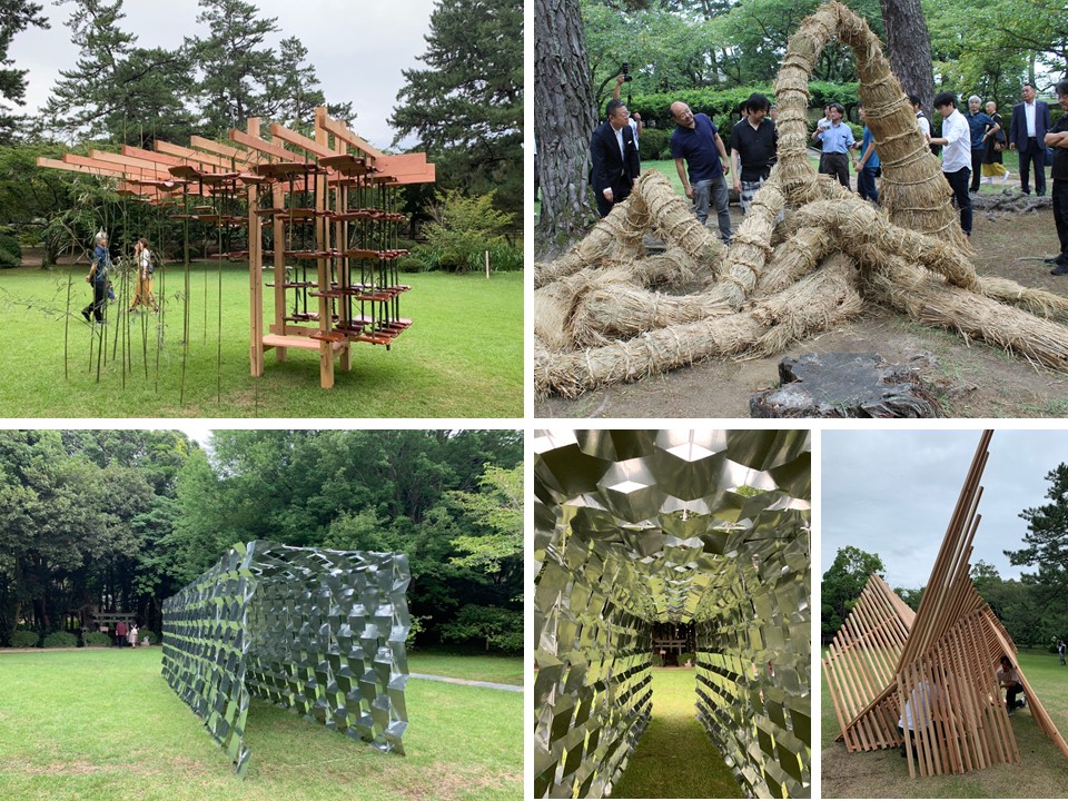今回、フォリーが設置されたのは出雲大社の参道わきの神苑だ。8グループがそれぞれのコンセプトのもとつくりあげた。