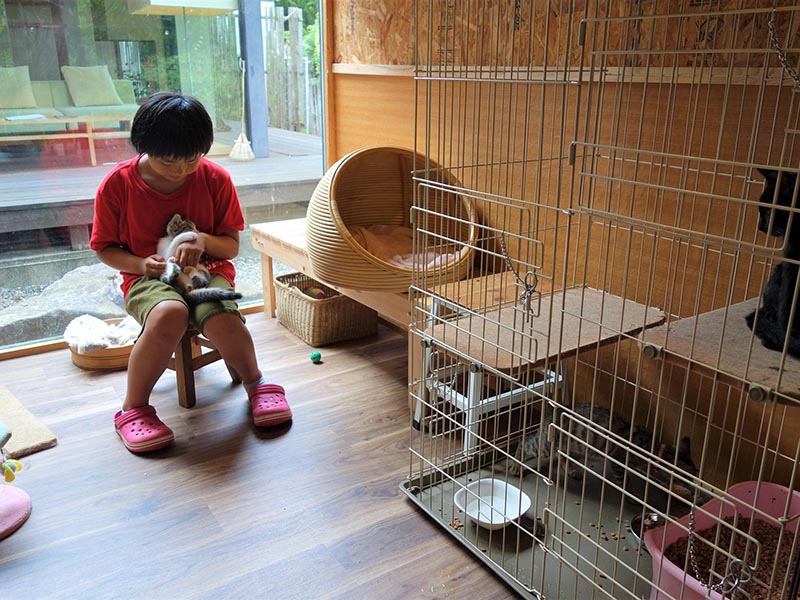 保健所や知人から引き取った子猫、成猫、約30匹を迎え入れ、猫庭の運営がスタート。次女・姫萌さんが館長、長女・歌七多さんが総長として、猫の世話や施設の掃除を担っている。お客さまに猫のエピソードや性格特性などを伝えるのも、2人の役目だ。その熱心な姿と、旅館に譲渡施設があるというもの珍しさ、そして猫ブームが重なり、譲渡数はわずか1年間で100匹を超えた。翌年にはこの実績を担保に、さらにクラウドファンディングで400万円を調達。コンテナは2階建てとなり、2階にある一部の客間からはコンテナの様子が垣間見え、猫好きに人気の部屋となっている。