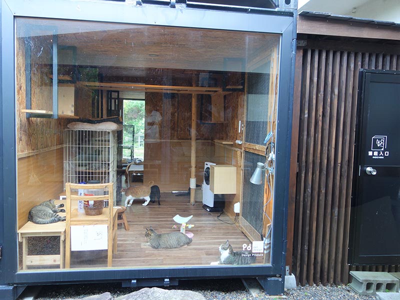 情報収集に乗り出した英樹さんは、庭の空きスペースに保護猫のシェルターを置くことを思いつく。しかし、置くシェルターは、旅館のイメージを損なわないものにしなくてはならない。そこでヒントになったのが、2006年にユニクロがニューヨークにオープンしたグローバル旗艦店「ユニクロ ソーホー ニューヨーク店」だ。コンテナを利用した店舗のかっこよさにインスパイアされた英樹さんは、クラウドファンディングを利用し、2年間かけて400万円を集め、コンテナを購入。コンテナには断熱材を入れ、冷暖房を完備するなど、猫が快適に過ごせるよう工夫した。また、旅館のロビーから猫の様子が見れるよう、側面をガラス張りにし、「猫庭」と名付けた。