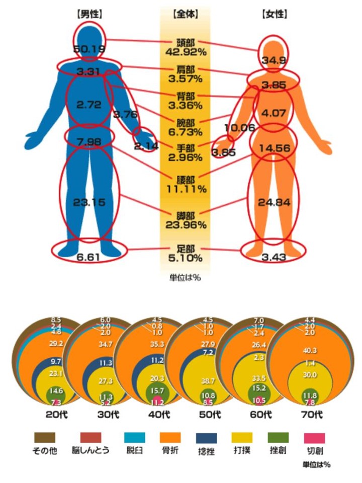 まずは転倒によるケガの内容を紹介しよう。札幌市の「路上転倒事故の実態調査」によると、転倒事故によるケガでもっとも多い部位は頭部で約43%。次に脚部で約24%。頭部と脚部で約7割を占めることになる。そしてケガの種類は骨折と打撲が圧倒的に多い。特に70代は骨折の割合が高く、40%以上を占める結果となっている。