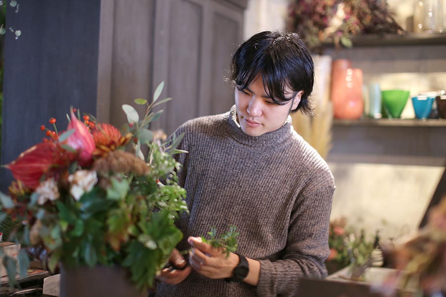 谷井聖さんは、株式会社Bondの運営する大阪・北浜にある人気カフェBrooklyn Roasting Companyに併設された花屋「bois de gui(ボワトゥギ)」で務めながら、同企業内にて立ち上げている自身のブランド「bulbus」で、商業施設のディスプレイ、広告撮影のスタイリング、空間装飾などを手がけている。