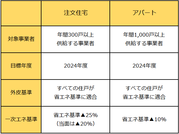 そして2019年11月16日、このトップランナー制度の対象に注文住宅とアパートを供給する大手事業者も追加された。具体的には注文住宅は年間300戸以上、アパートは年間1,000戸以上供給する事業者だ。両者とも目標年度を2024年度として、注文住宅事業者の場合は、供給するすべての住戸が外皮性能基準の省エネ基準に適合すること、一次エネルギー消費量基準の省エネ基準よりも25%(当面は20%)下回ることを目標としている。そしてアパート事業者の場合は、供給するすべての住戸が外皮性能基準の省エネ基準に適合すること、そして一次エネルギー消費量基準の省エネ基準よりも10%下回ることを目標としている。