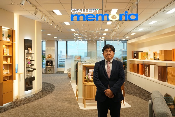 名古屋駅前の大名古屋ビルヂング内にある、ギャラリーメモリア 名古屋駅前店・店長の荒谷真二郎さん。名古屋に異動する3年前までは、大阪の本社で営業を担当。ハウスメーカーへの営業では、過去には暗いイメージから新築時に仏壇を合わせて提案することは避けられていた。だが、最近は、仏間は減ってきたものの、精神性のある場所を作ることに前向きな話も出るようになったとか仏壇というと、金箔や金粉が施された漆塗りの“金仏壇”、黒檀や紫檀といった銘木の木目を生かした“唐木(からき)仏壇”が伝統的なものだ。そこに近年は、モダンなデザインの都市型・家具調仏壇が加わった。