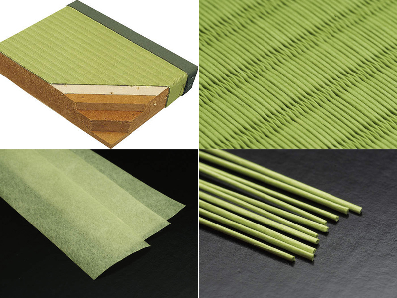 1991年に工業的に安定した畳表の生産を目指して開発を開始、「い草」の形状やクッション性、吸放湿性能などの再現を目指し、1996年に機械すき和紙をこより状に加工、樹脂コーティングした畳表を発売したという。