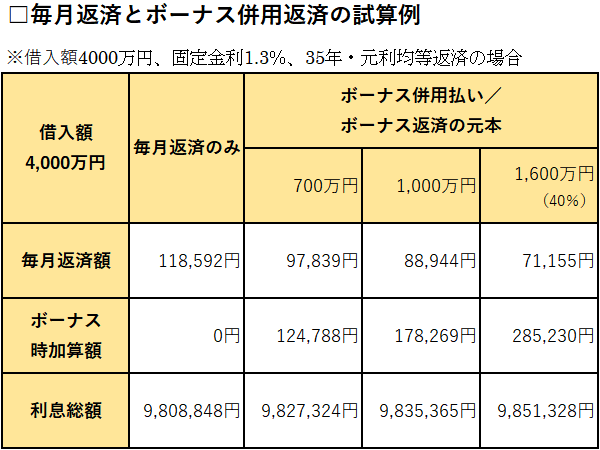 ボーナス併用無しのプランだと、毎月返済額は118,592円だ。借入額の40%にあたる1,600万円をボーナス払いすれば毎月返済額は71,155円まで減額できる。だが、ボーナス時には285,230円が加算される。少し負担であろうか。700万円だけボーナス返済に設定するプランにすれば、毎月返済額が97,839円と10万円を下回り、ボーナス時の加算額を124,788円に抑えることも可能だ。万が一、ボーナスが激減しても支払える金額でまずは試算してほしい。ちなみに、利息総額は下表のとおりボーナス払いが少ないほど低額になる。半年分の元本をまとめて返済するため、ボーナス払いまでの利息が加算される仕組みだ。