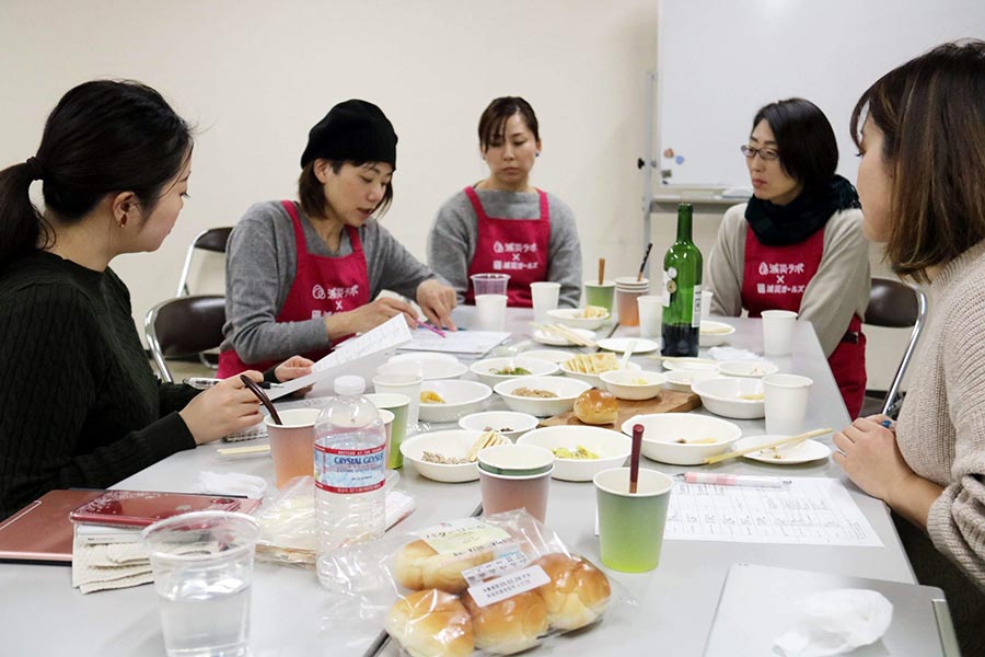 活動はローリングストック料理のワークショップ、ハザードマップ、災害時のトイレのワークショップなど。ローリングストックとは缶詰や乾物・ドライパック、乾麺など自宅に備蓄(ストック)してある食品をローリング(回転)させながら使うというもの。備蓄を定期的に消費、その都度買い足して循環させるという方法で、こうすれば食品を無駄にすることなく、常に一定量を災害時に向けて備蓄し続けることができる。さらに備蓄した食品を日常的に使っていれば、災害時にもいつもと同じ味が食べられ、食べる側も作る側も安心だ。減災ガールズの活動のベースには「いつもの味が心と体を癒した」という被災体験者の言葉があるという。