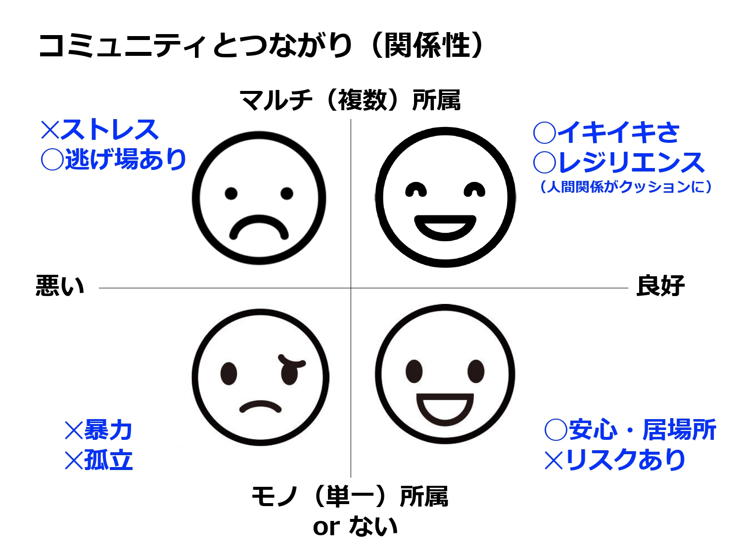 縦横の軸に仕切られて4つのゾーンが作られるわけだが、コロナ下でも、そうでない状況でももっとも幸せで、不幸にも立ち向かえるのは複数のコミュニティに属し、いずれでの人間関係も良好である人。会社だけ、家庭だけといったように単一のコミュニティにしか属していない人はそこでの人間関係が壊れるだけで弱くなるし、たくさんのコミュニティに属していても関係が悪ければ幸せとは言い難い。どこにも属していないとしたら、どう感じるだろう。聞いていて、この機に自分と社会、人間関係を同様の軸で見直してみてもよいのではないかと思った。