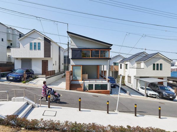 立地しているのは横浜市西区。横浜駅から1駅、京浜急行本線戸部駅から歩いて5分ほどの坂の途中である。立地上の大きな特徴は道を挟んで向かい側の一角がすべてマンションで、道路際は細長く提供公園になっているということ。階段状になった700m2ほどの公園にはさまざまな木々が植えられており、比較的区画の小さな住宅が多い周辺からするとそこだけが開放的な空間。物件の前を通り過ぎた先にも4000m2ほどの公園があり、建物の向かい側にはすべて緑があるといってもよいほどの借景に恵まれた立地なのである。