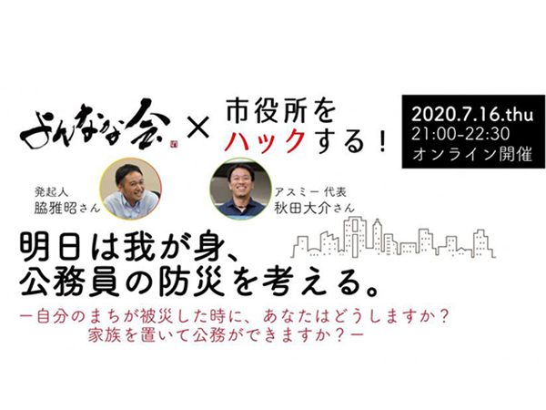 2020年7月16日開催の「明日は我が身、公務員の防災を考える(主催:よんなな会、市役所をハックする!)」。オンライン上でコミュニティ形成を行う数名の公務員が登壇し、よんなな会発起人 脇雅昭氏をゲストに迎え、一般社団法人アスミーの紹介や防災についてディスカッション形式で進んでいった。参加者は公務員や民間企業・個人などさまざま。防災やこの動きに関心のある約130名がオンライン上に集まった災害大国、日本。2011年の東日本大震災をはじめ、地震や豪雨・台風、火山の噴火などの自然災害が日本を襲い、近年その発生件数と被害額は、増加傾向にある。2020年7月にも、記録的な集中豪雨が九州・熊本を襲い、多数の被害者が発生した。スマホに緊急速報が入ってくる度に、ドキッとさせられる人も多いのではないだろうか。