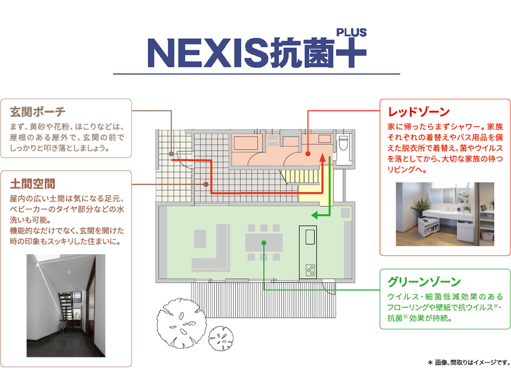 間取りの考え方は、病院内を汚染区域と清潔区域にゾーニングするように、家の中もレッドゾーンとグリーンゾーンに分け、外から戻ったらレッドゾーンでウイルスや菌を落とし、抗ウイルス、抗菌仕様で守られたグリーンゾーンで安心して暮らすというものだ。