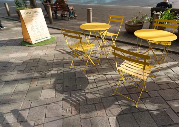そのイベントの様子をご紹介する前に、そもそも今回の道路占用許可基準の緩和措置とは何か、どういう意味を持つかを簡単にご説明したい。これは3密を防ごうと席間を開けると店内だけではこれまで通りの客数を入れられなくなる、主に飲食業界などの要望を受けたもの。原則として幅2m以上(通行量が多い場合は幅3.5m以上)の歩行空間を確保する、施設付近の清掃に協力するなど一定の要件を満たした場合には路上にテーブル、椅子などで仮設施設を設置しての営業が認められるようになったのである。飲食業以外の業種、合意が得られれば2階以上や地下、沿道以外の店舗も対象になる。歩道のない車道でも交通規制などで安全な歩行空間が確保できるなら可能。清掃などに協力すれば占用料は免除される。