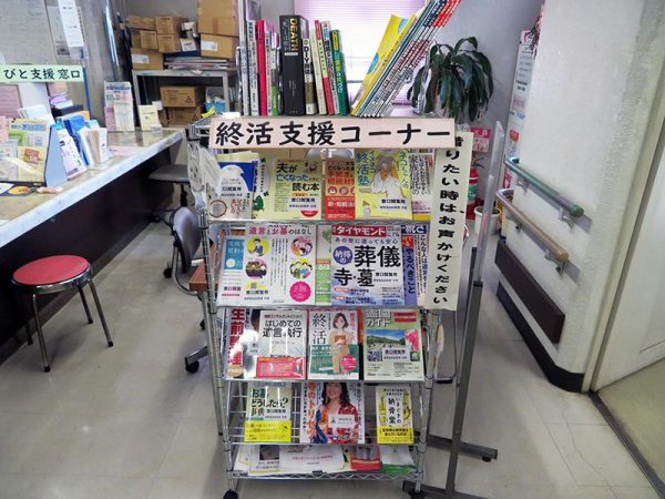 また、事業への参加を呼びかけ、認知してもらうための活動も行っている。「終活なんて冗談ではない」という人にも楽しく関心を持ってもらう入り口としてかるたを作ったり、去年は映画、落語会などのイベント開催も。その際には400人定員のホールが満員になったほどとか。職員手作りのおひとりさま支援ニュースをこれまでに5回発行。福祉や保健関係全般に詳しい市役所OBがコンシェルジュとして相談に乗るコーナーには役に立ちそうな書籍、雑誌なども揃えてある。