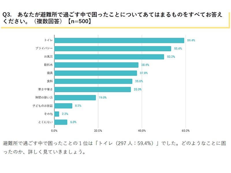災害関連死を防ぐためには、トイレが有効というデータがある。総合マーケティング支援を行う株式会社ネオマーケティングが実施した調査結果によると、「あなたが避難所で過ごすなかで困ったことについてあてはまるもの」という問いで最も多かったのが「トイレ」で59.4%だった。