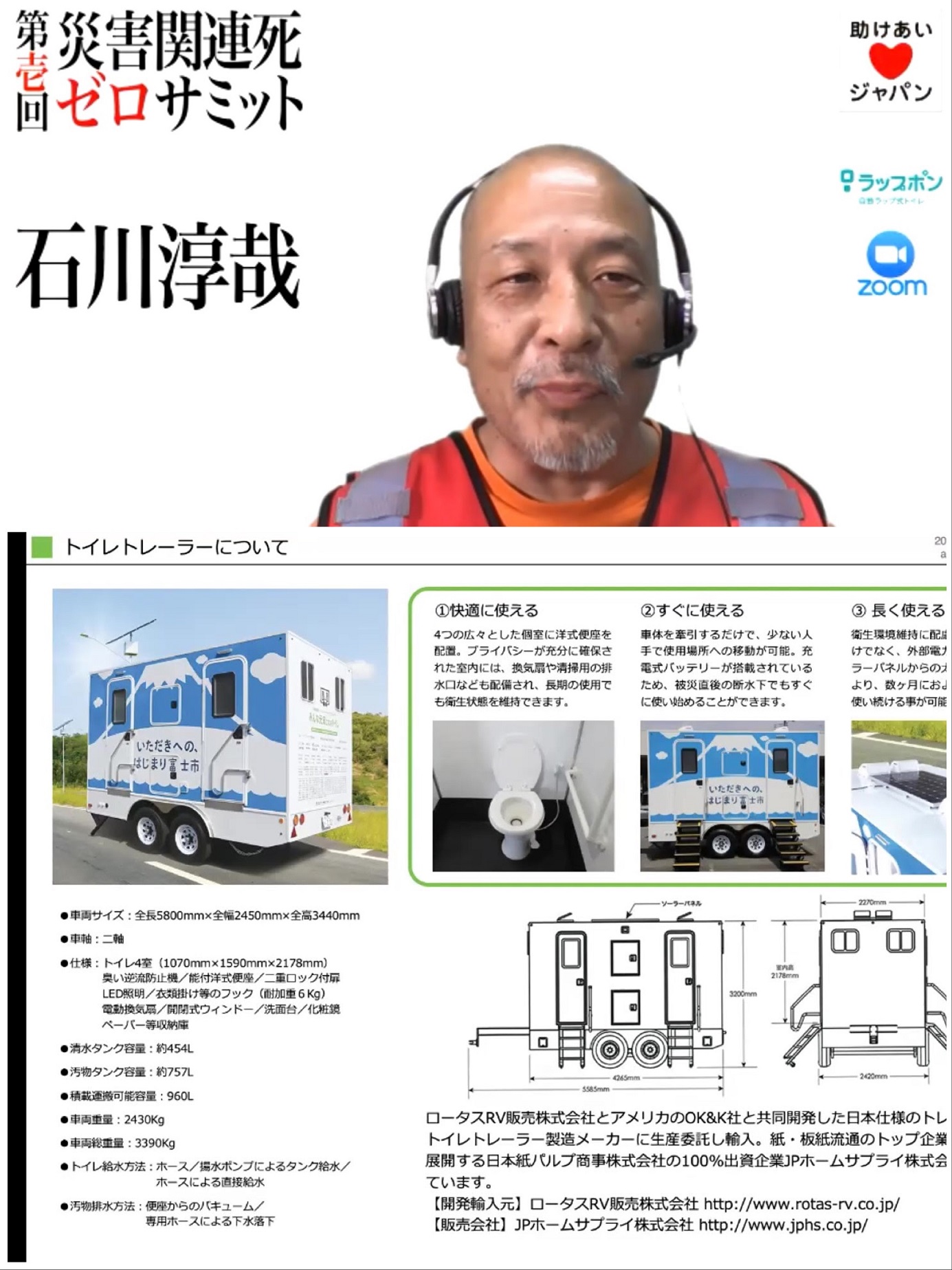 一方、石川氏も自身が進めているプロジェクト「みんな元気になるトイレ」を説明した。移動設置型の“トイレトレーラー”を日本全国の1,741の市区町村に1台ずつ入れてもらうのを目標としているそうだ。