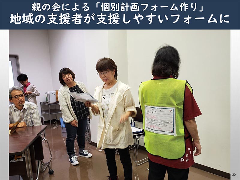 湯井氏自身は、次男に重度の知的障がいがあることから、警戒レベル3の「避難準備・高齢者等避難開始」で避難を開始し、レベル4の避難指示までに完了することを目標にしている。障がい者の避難にあたっては、個々の障がい者に必要な支援や注意事項などを、わかりやすくまとめたメモのついたビブスやカードなどを用意している団体もある。