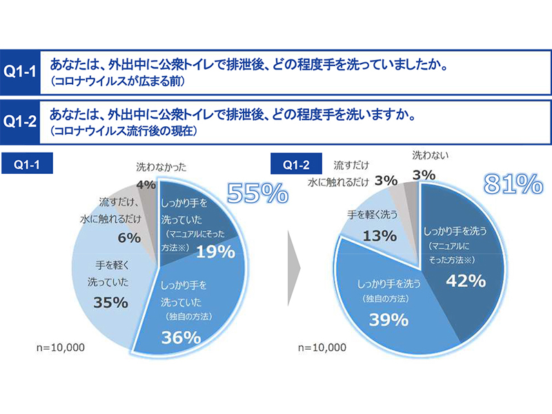 手洗いに関する意識の変化からみていく。外出先の公衆トイレにおいて排泄後、「しっかり手を洗っていた/洗う(マニュアルにそった方法、独自の方法)」と回答した人の割合は、コロナウイルスが広がる前では55%だが、流行後では81%と26ポイント上昇(上記グラフ)、しっかりと手洗いを行っている人が大きく増加していることがわかる。