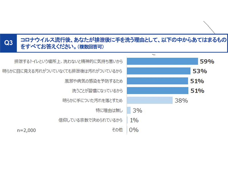 コロナウイルス流行後にトイレで排泄後に手を洗う理由を聞くと(複数回答可)、「洗わないと精神的に気持ち悪いから」が59%ともっとも多い回答となっている。続いて、「排泄後は汚れがついているから(53%)」、「風邪や病気の感染を予防するため(51%)」、「洗うことが習慣になっているから(51%)」と、それぞれの回答が50%以上を占めており、清潔さを保つとともに予防の意味で、しっかりと石けんを用いて手を洗っているということだろう。