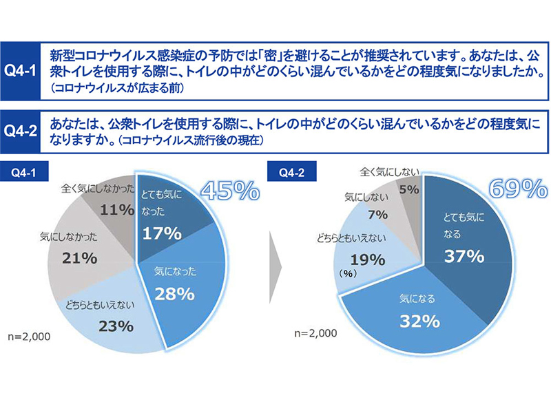 新型コロナウイルス感染症の予防対策の重要なポイントとして、「密」を避けることが推奨されている。公衆トイレも場所によっては混雑するケースもみられるが、使用する際に、トイレの中がどのくらい混んでいるか、どの程度気になったのかを聞いたところ、「とても気になった/なる」「気になった/なる」と回答した人の割合は、流行が広まる前は45%、流行後では69%と20ポイント以上増加している。