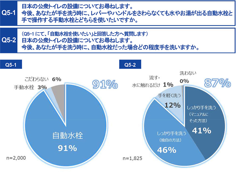 多くの人が手洗い時に使用する水栓金具も気になるものだ。自動水栓(レバーやハンドルをさわらなくても水やお湯が出る)と手で操作する手動水栓とどちらを使いたいかという質問に対しては、「自動水栓があれば使いたい」と回答した人の割合が91%と非常に高い結果となった。不特定多数の人が使用する公衆トイレにおいては、自動水栓が強く求められている。また、自動水栓が備え付けてある場合では、「しっかり手を洗う(マニュアルにそった方法で/独自の方法で)」と回答した人は87%にのぼっている。