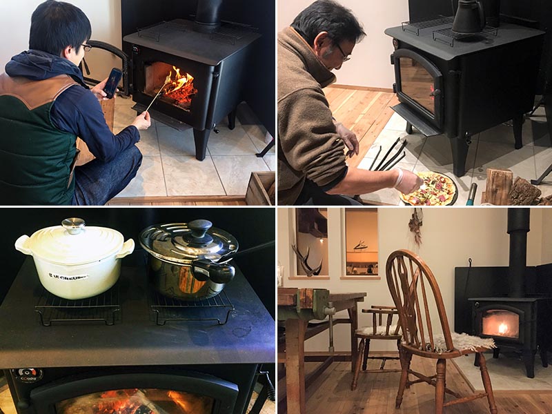 まず、圧倒的に暖かい。体の表面しか温まらない自宅のFF式ガスストーブと違い、建物が暖まり、やわらかな熱が全身を覆う。芯からのポカポカが持続する。ぼんやり炎を見つめて、うたた寝する。朝食用にチェダーチーズを炙ったり、ピザを焼いたり、カフェ用にお湯を沸かしたり、おやつにサツマイモを焼いたり、調理にも使えるマルチ選手だ。ゲストの満足度も高く、想像以上にいい仕事をしてくれる。