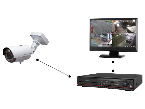 屋外につけるカメラとレコーダーをケーブルでつないで使用する。