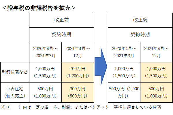 この非課税特例は2021年12月31日の契約までが適用期限となっているが、同年4月1日以降の契約の場合は非課税枠が新築住宅などで700万円(同1,200万円)、個人売主の中古住宅で300万円(同800万円)に引き下げられる予定だった。それが今回の改正により、2021年3月までと同額に拡充されることになったのだ。