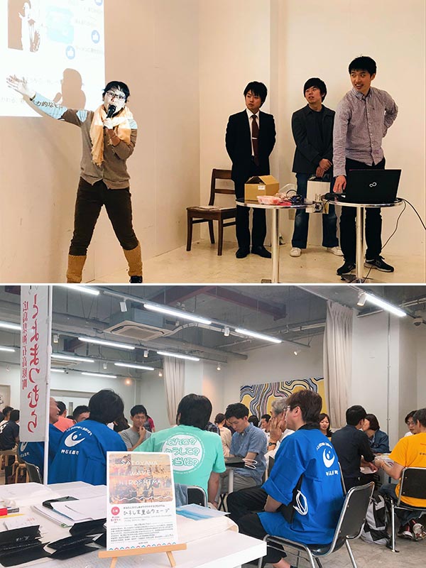 上:最終プレゼンにて、神石高原町への参加者が、「地域内交流」と「東京とのつながり」を創出する「リアルSNS」というプランを発表下:東京での説明会に、神石高原町の担当者が現地からやって来て熱のこもった話を披露