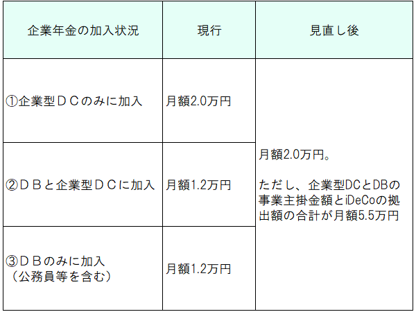 ・企業年金の確定給付型(DB)加入者のiDeCoの拠出限度額の引き上げ。