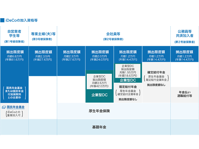 iDeCoの拠出限度額=月額5.5万円-(企業型DC+DBの事業主掛金額)≦ 2万円