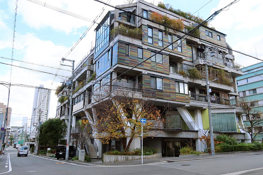 計画実施にあたっては社外の有識者をメンバーに迎えて建設委員会を設置、長期にわたって使える可変性の高い建物を計画した。具体的には建物の骨格となるスケルトン(構造躯体)と生活に合わせて自由に変えられるインフィル(住戸・内装部分)を分けて考えられたスケルトン・インフィル方式(SI方式)を採用、外壁や配管も自由に移動、取り換えできるようになっている。加えて建物を立体的なまちとして想定、共用廊下や階段をふれあいのスペースとする考え方や建物緑化も取り入れられており、見た目からして他の集合住宅とはかなり違うものになっている。
