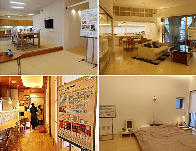 一般公開ではそのうちのいくかの部屋、設備に加え、特徴的な住戸を見学したのだが、個人的にもっとも興味深かったのは高齢化に対応、住む人の変化に合わせて5つの室空間が分離、結合しながら、その時々の暮らしに合った住まいになるという「自在の家」(設計/設計組織ADH)。