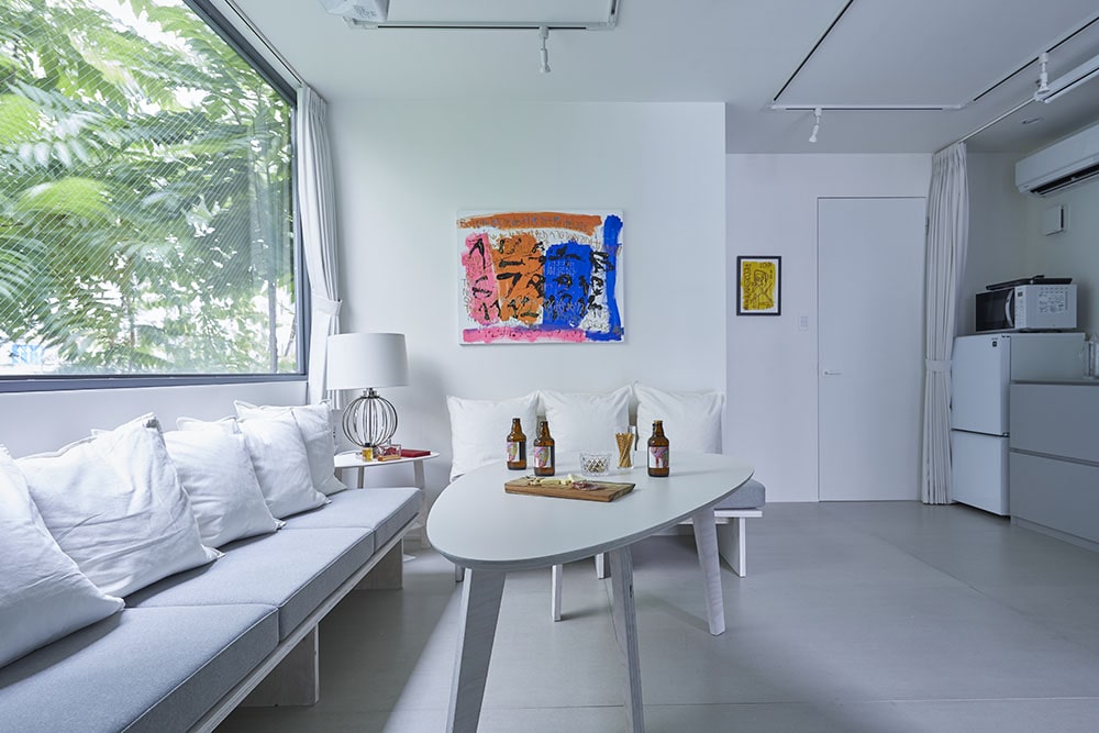 現状は、ワンフロアに44m2の部屋が1室。それが2フロアある。各部屋には提携するアートセンター&福祉施設「やまなみ工房」のアート作品が展⽰してあり、室内はギャラリーのように滞在者の⽬を楽しませてくれて いる。まさに「GALLERY HOTEL」の名前にふさわしいインテリアだ。建物の躯体となっているのは、建築用のコンテナ、つまり車輪があればトレーラーとなる鉄の箱だ。外観は、リブのある鉄の板そのものと言ってもいい。しかし一歩中に入ると、印象は一変する。