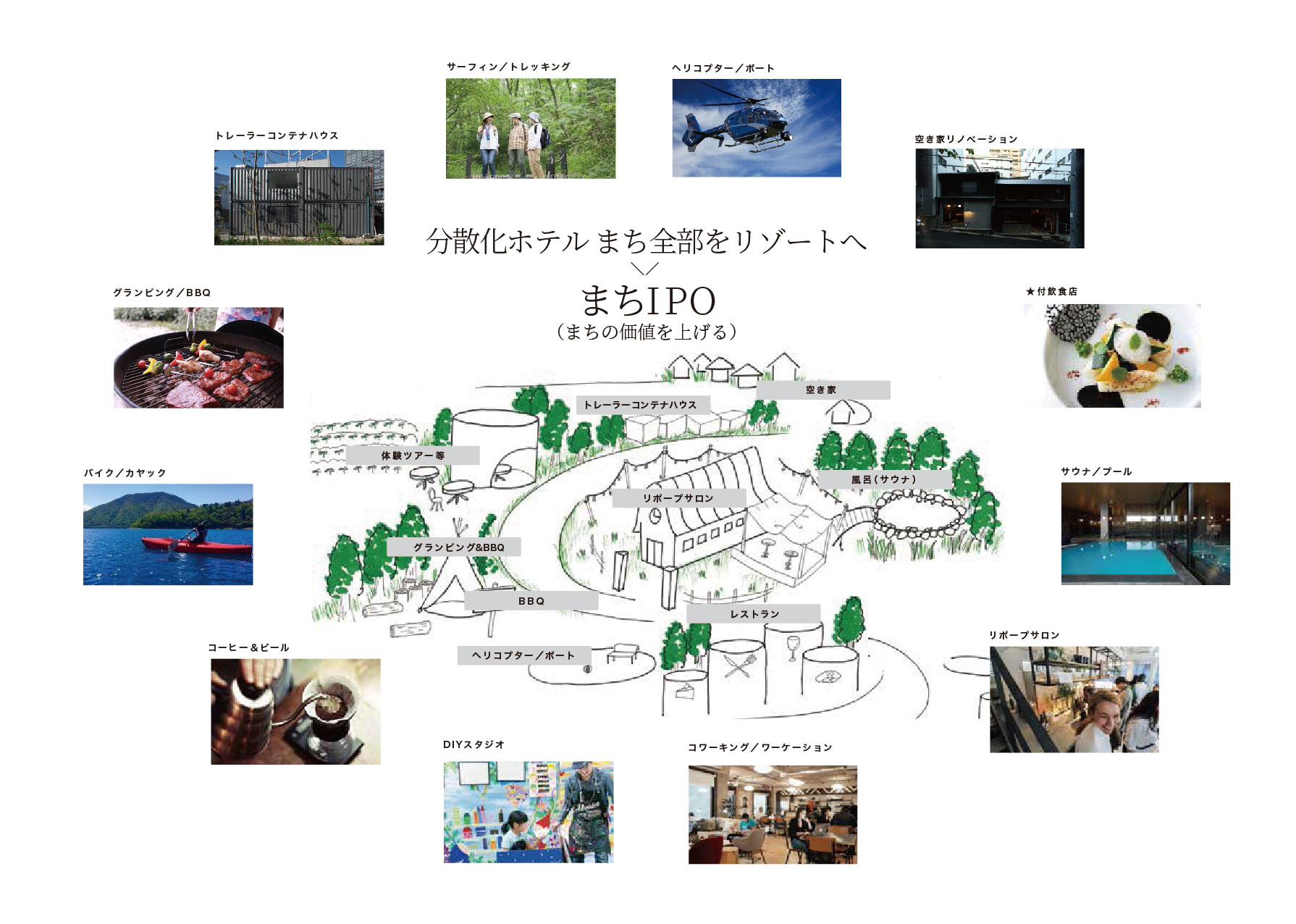 「鉄筋コンクリートのひとつの建物の中に、宿泊やグルメやアミューズメントをまとめたのが、今までのリゾートの考え方としたら、コンテナホテルを中心に街全体の施設を利用する分散型ホテルという考え方です。既存の施設や資源を利用し、中心に宿泊施設として、コンテナホテルがあるイメージです」(同)