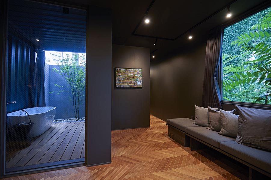 間口の狭い小さな土地に、スクエアな黒い外観の建物があった。一見してホテルとは思えないこの建物が、9(ナイン)株式会社が運営するホテル「GALLERY HOTEL DISTORTION 9」だ。同社代表取締役の久田一男さんに話を聞いた。「建物の躯体は建築用のコンテナそのものです。それをユニットとして組み立てて内装を施し、建築物として利用しています」(久田さん:以下、同)