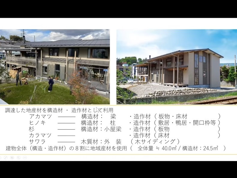 近場で使うことで環境負荷が低くなる“ウッドマイレージ”という指標もある。また、金井さんからは「伊那にしかない木があり、受講者のみなさんがそれぞれ住んでいるところにしかない木もあります。そういう木を使うことは、例えば伊那に多いカラマツだと赤っぽい色が出たり、アカマツであれば曲がったような梁になったり、それぞれのよいところが建物の独自性を出すのではないでしょうか」と語った。