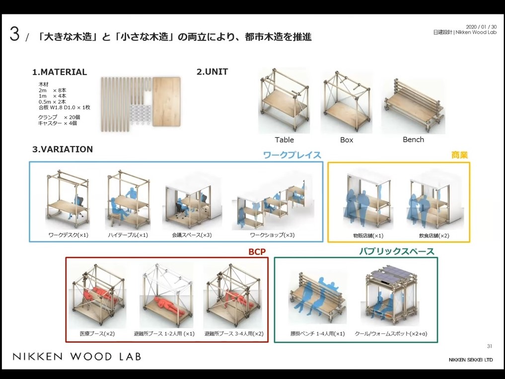 なお、大庭さんによると「中規模・大規模建築では、木造を選択すると金額が高くなってしまう」とのこと。しかし、「10年前に僕が入社したころは木造はほとんどなかったのですが、行政が動いてくれて、木材利用促進法をはじめ、公共施設などで木を使いなさいというような条例も出ています。あと、最近ではSDGsや、政府からカーボンニュートラル(脱炭素社会)の話が出たりして、大きくそれに貢献できるのは大規模な木造だね、となりつつあるので、問合せ案件は増えてきています」と語った。