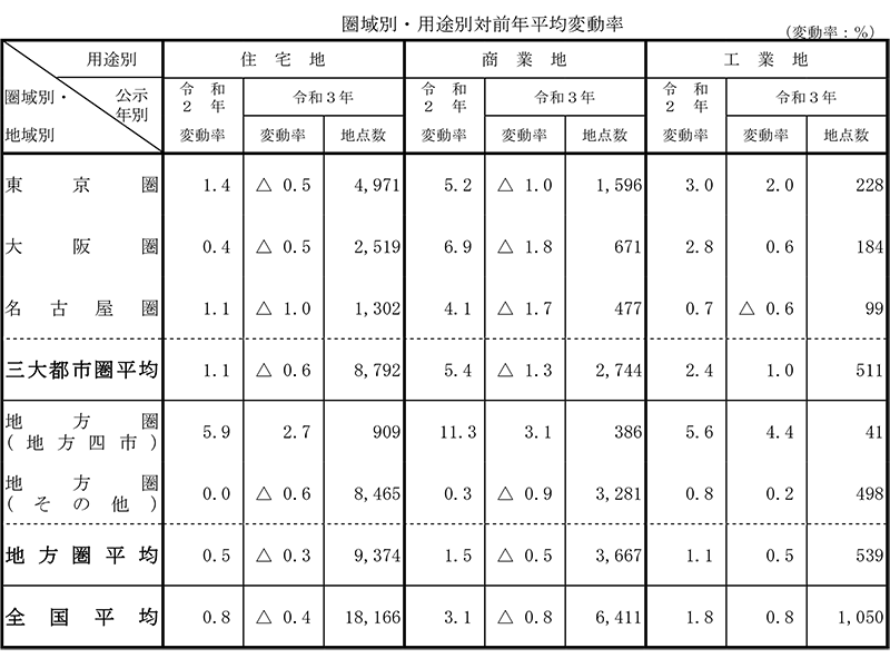 2021年の地価公示は、東京圏と大阪圏では異なる地価動向を見せている。大阪圏は観光業の低迷によって商業地に大打撃を与えたが、それ以外は特に大きな影響を受けていないという特徴がある。大阪のビジネス街は企業の支社が多いため、東京のようなテレワークによる大きな影響が生じていない。