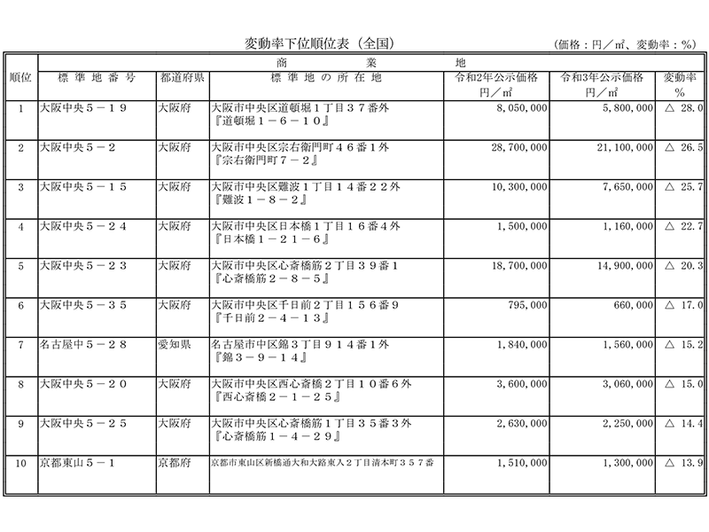 特に2021年の地価公示の結果は、大阪市の商業地の下落が目立っており、下落率全国上位10位のうち8地点が大阪市、1地点が愛知県、1地点が京都市の商業地である。全国の商業地で下落率が最も大きかった地点は「大阪市中央区道頓堀1丁目(標準地番号:大阪中央5-19)」であり、前年比▲28.0%にもなっている。