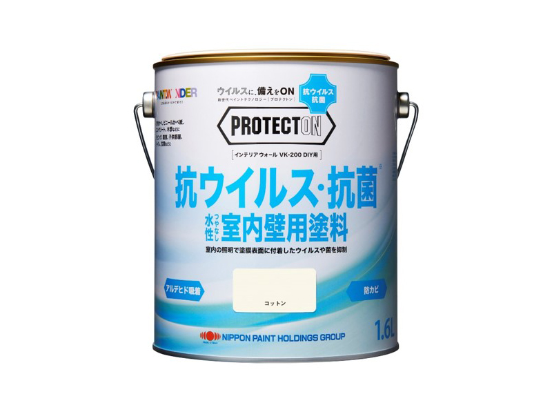 日本ペイントから3月に発売された商品(PROTECTON インテリアウォール VK-500)も抗ウイルス・抗菌機能 を持つ室内壁面用の水性塗料だ。壁や天井に塗ると、室内の照明に反応、塗料に含まれる光触媒が作用し、塗膜表面に付着したウイルスや菌を99.9%(*1)以上抑制。塗膜が傷ついたり、はがれたり、表面に過度な汚れが付着しない限り効果は継続する。また、ビニール壁紙や接着剤、建具合板などから発生する室内汚染物質を化学的に吸着して除去する機能もあるという。