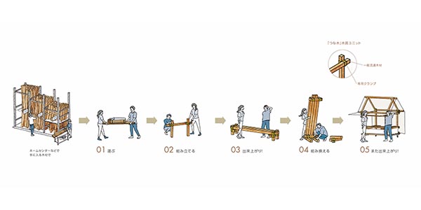 総合建築設計事務所の株式会社日建設計による木質ユニット「つな木」プロジェクト。一般に流通している45×45ミリの角材とクランプと呼ばれる接合部材、キャスターを基本とし、ベンチやブースなどを造ることができるものだ。