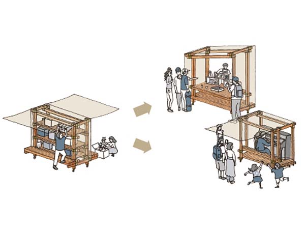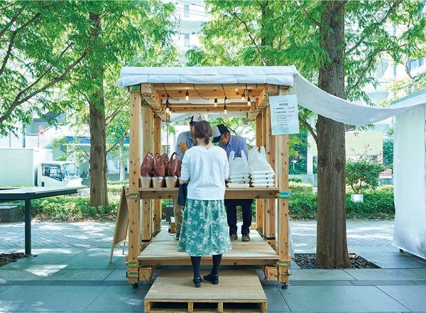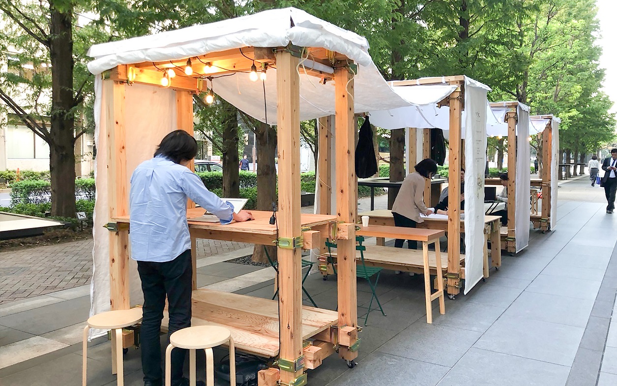 2019年秋に日建設計の社屋前の公開空地で「OUT DOOR LOUNGE」というイベントを開催し、社会実験として周辺の店舗による飲食ブースやミーティングスペースなどをつな木で作り、設置した。