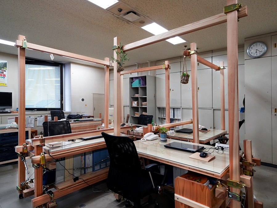 トライアルの第一弾は、ある木造プロジェクトを通じて交流のあった徳島県庁。「こんなものがほしい」というリクエストをもらうなどして、職員が実際につな木を組み立ててワークプレイスを造った。まさに、ユーザーが必要なものをデザインし、自ら製作していくという場面だった。