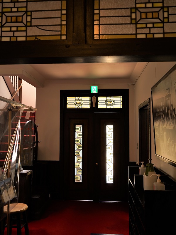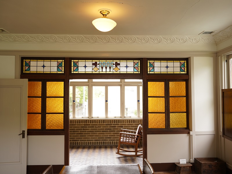 中に入って、和館につながる廊下から玄関の方を見ると、欄間と玄関の扉に設えられたステンドグラスに統一されたデザイン性を感じる。「新緑の季節になると、ステンドグラスに庭の木の緑色が映り込みます。季節に応じて色合いが変わっていくのがきれいなんですよ」と坂口館長。