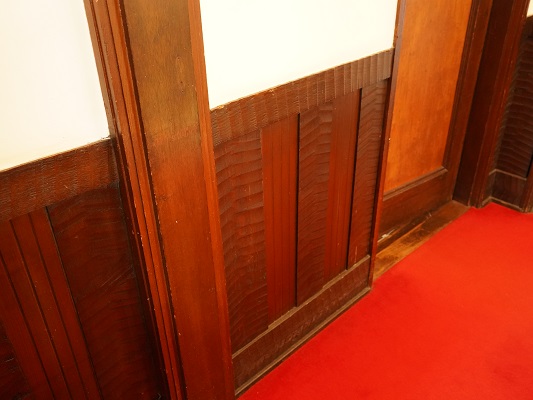 洋館の玄関に置かれたオリジナル家具。建物が建てられたときに合わせてオーダーされたもので、帽子かけやステッキ入れがあり、外国人のゲストが来たときに身支度をするのに使われた。上部の半円の真ん中に上下に延びる木は、鍵をモチーフにしたデザインが施されているかつて商談や海外からの客を迎えるパーティーなどが開かれていた洋館。設計図はあるものの、設計者は不明。「井元為三郎が仕事で出かけたニューヨークなどの建物を見てきて、こうだった、ああだったという意見を加えたのではないでしょうか」と坂口館長は語る。