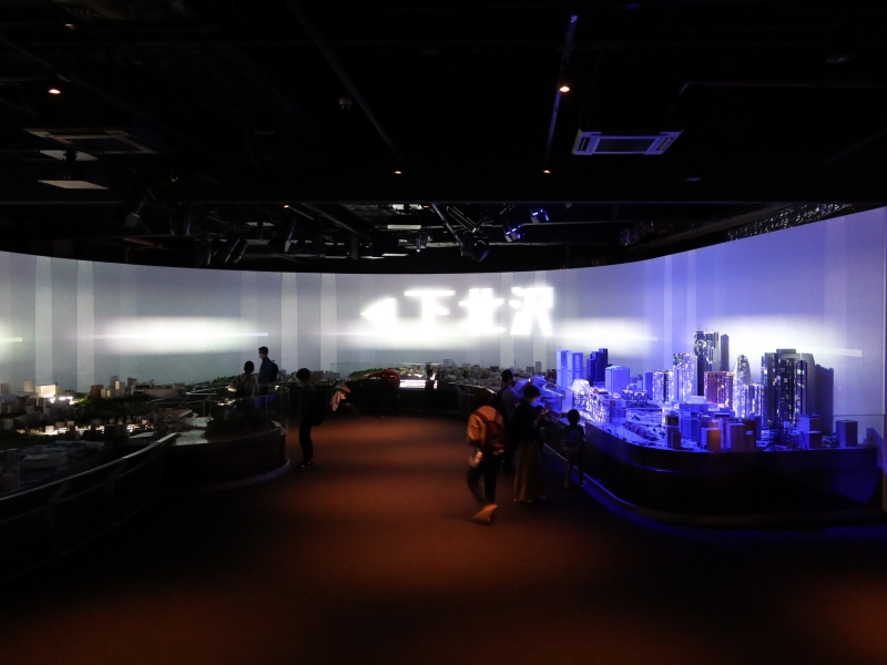 2階に移動し、長い時間楽しんだのが、小田急線沿線の街並みを再現し、10車種のロマンスカーと5車種の通勤車両が駆け抜ける「ジオラマパーク」(日によって走っていない電車もある)。遠くから眺めてもいいし、近くによって走る電車や丁寧につくられた街並みを見るのもワクワクする。また、一定の時間ごとに(45分に1回)「時間と距離のロマンス」と題したジオラマショーが上演され、プロジェクションマッピングとオリジナルソングによる演出に引き込まれた。