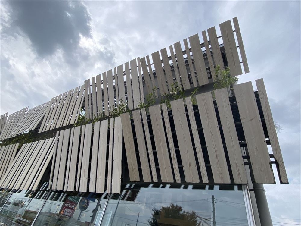 茨城県は干しいもの特産地。カフェで販売する干しいもの繊維をイメージしたスギ材のスクリーンを外壁に設置した。