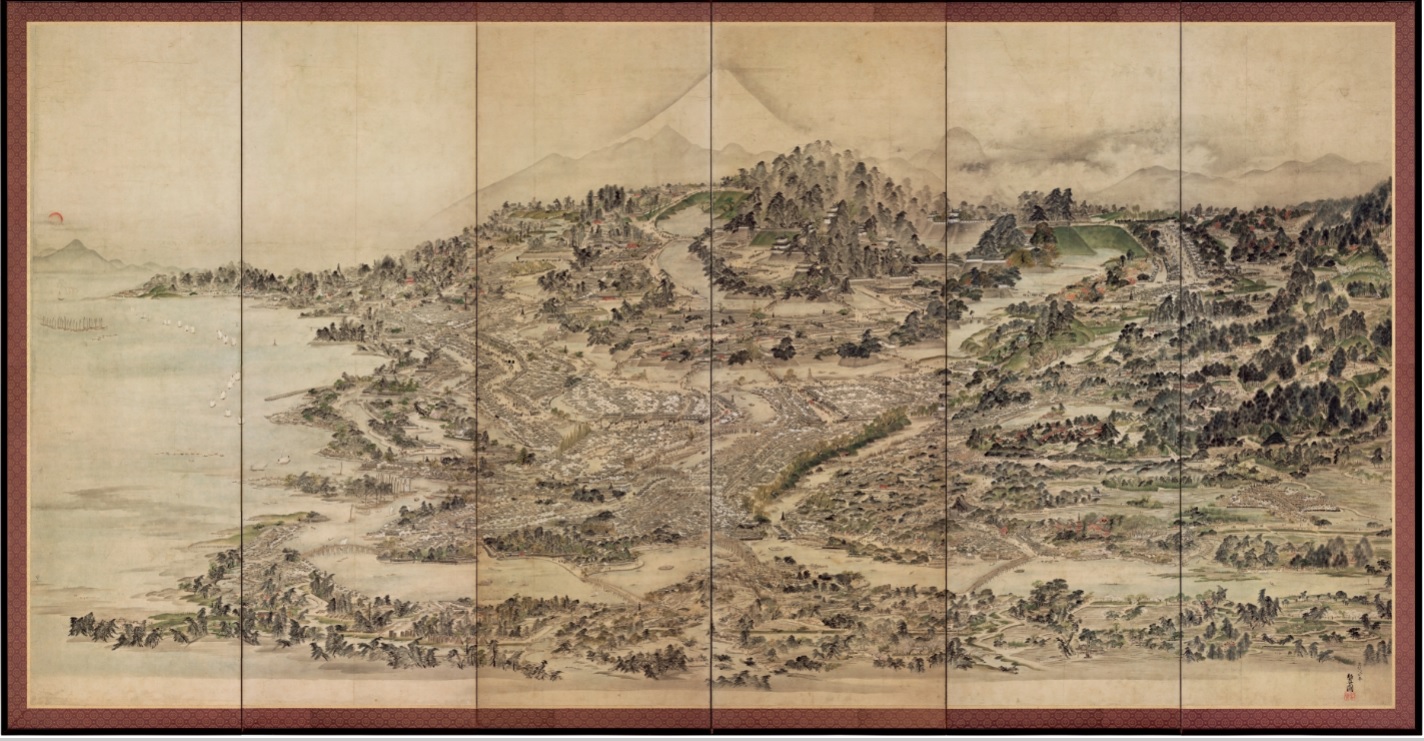話は岡山県津山市にある津山郷土博物館が収蔵する「江戸一目図屏風」から始まった。この屏風は寛政6(1794)年に津山藩の御用絵師になった江戸生まれの浮世絵師・鍬形蕙斎(くわがたけいさい)が文化6(1809)年に描いたもので、画面中央に江戸城、背後に富士山、左に江戸湾、そして手前に隅田川や水路が縦横に走る下町エリアが俯瞰的に描かれている。