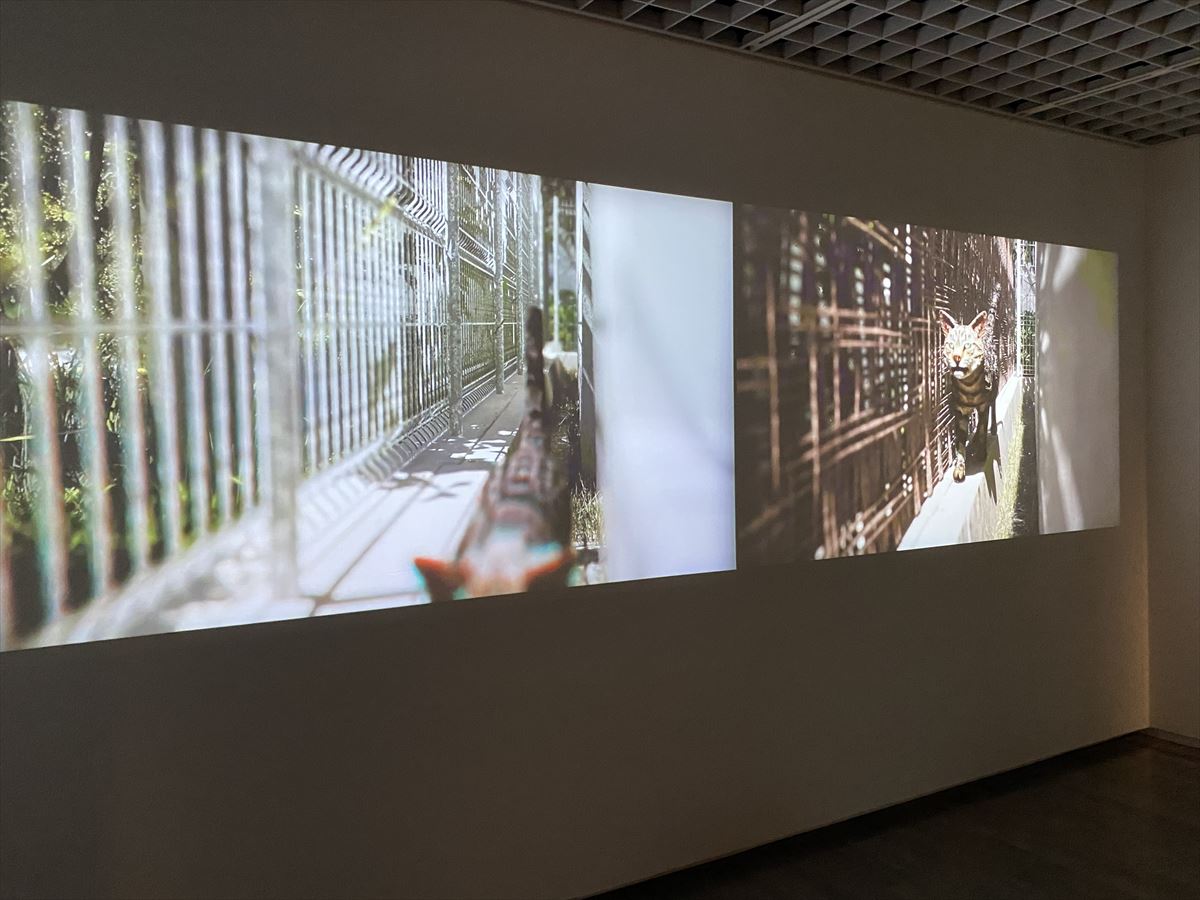 「東京計画」と聞いて、建築関係者であれば思い浮かべるのは、故・丹下健三(1913~2005年)の「東京計画1960」。東京湾に海上都市を建設して陸上の都市と結ぶ壮大な構想だ。それを知っている人は、東京計画と聞くと反射的に巨大な都市模型を想像する。しかし、ここには模型はない。あるのは、ネコの視点から見た複数の映像展示だ。