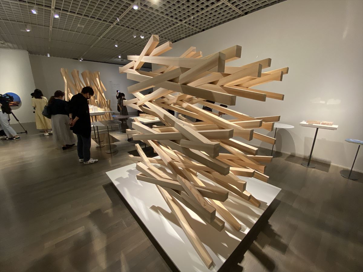 ……と、有料ゾーンでは、隈氏がこの20年ほどに国内外で手掛けたプロジェクトが網羅的に紹介されている。大きな模型や動画映像をふんだんに使った展示は分かりやすく、建築展を見慣れていない人にもきっと楽しい。